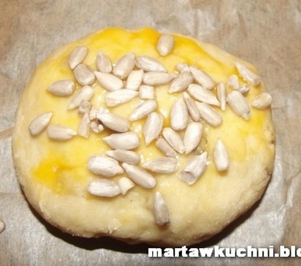 Gdy ciasto wyrośnie formujemy 10 bułeczek. Najpierw tworzymy kulkę, którą następnie spłaszczamy. Blachę wykładamy papierem do pieczenia i układamy bułki, przykrywamy ściereczką i odstawiamy do wyrośnięcia na 20 minut. Gdy bułeczki wyrosną, smarujemy je z żółtkiem połączonym z 1 łyżką mleka a następnie posypujemy ziarnami słonecznika. Tak przygotowane bułki wstawiamy do nagrzanego piekarnika do 200 stopni i pieczemy przez ok. 20 minut do momentu zarumienienia.