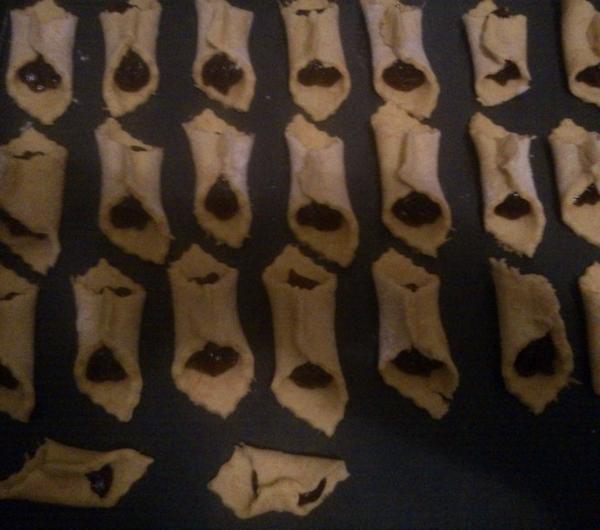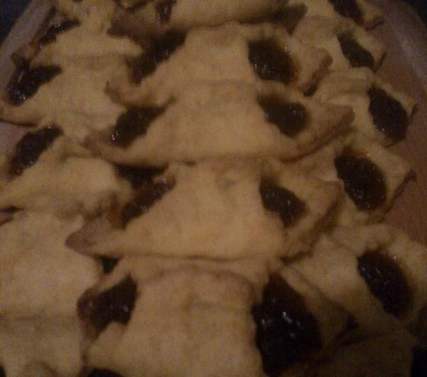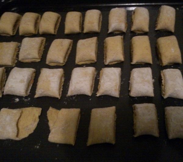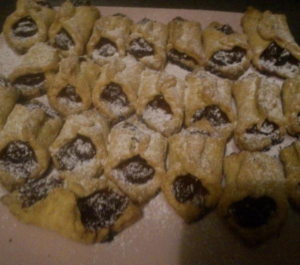 Wykonanie:Z podanych składników zagnieść ciasto. Rozwałkować bardzo cienko, radełkiem albo nożem pociąć ciasto na małe kwadraty.Zlepiać do siebie 2 albo 4 rogi (kwestia gustu ile rogów zlepicie) z jabłkiem lub marmoladą w środku. Piec w temperaturze ok. 180° na złoty kolor. Po upieczeniu posypać cukrem pudrem.