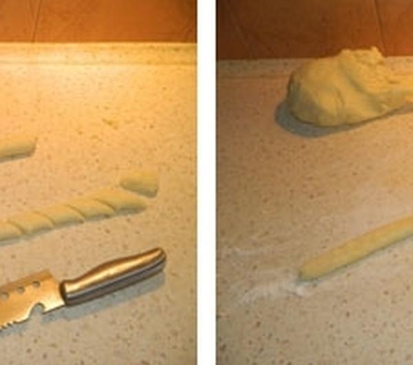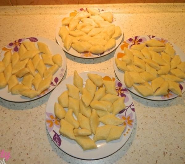 Kolejny krok to połączenie ze sobą przeciśniętych ziemniaków, rozkruszonego sera, mąki pszennej i ziemniaczanej z jajkiem i szczyptą soli. Wyrabiamy ciasto. Będzie one w dłoniach przyjemnie „pulchne” – gdyby ciutkę za bardzo się kleiło, podsypujemy mąką pszenna – gdyby się okazało, że jednak za bardzo się nie klei – podsypujemy mąkę ziemniaczaną.Odrywamy po kawałku i formujemy cienkie wałeczki, które następnie lekko spłaszczamy i dzielimy nożem na zgrabne – nie za duże „kopytka” (tak około 2 , 5 cm szerokości i 3 , 5 cm długości – jak kto lubi).