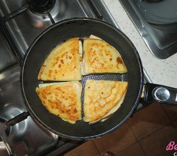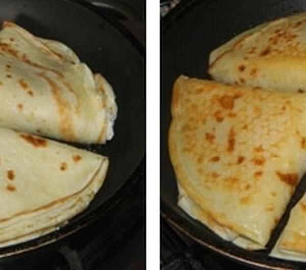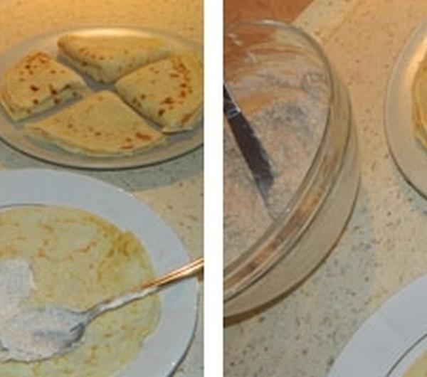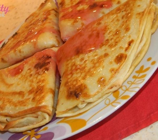 Tak przyprawionym serem smarujemy nasze naleśniki i składamy je na 4 (można też po prostu zawijać je w ruloniki, ale u mnie w domu zawsze były trójkąciki więc przy nich zostanę). Smażymy na odrobince margaryny doprowadzając je do delikatnie złotego koloru. Robią się wtedy z wierzchu tak przyjemnie chrupiące…