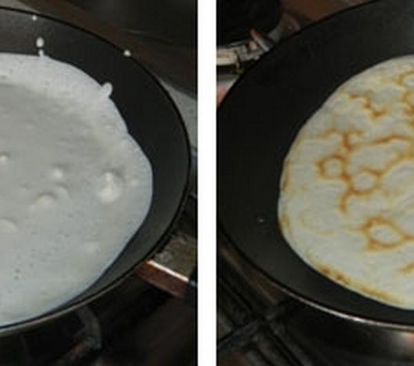 Rozpoczynamy od usmażenia naleśników – takich samych jak w poprzednim przepisie (naleśniki ze szpinakiem). Tak więc odmierzamy 40 dkg mąki, wbijamy do niej 1 całe jajo, solimy dla smaku, wlewamy około ¾ szklanki zimnego mleka i na początek ½ szklanki wody mineralnej gazowanej – całość mieszamy.Powstała masa z pewnością będzie jeszcze bardzo gęsta, więc dolewamy jeszcze trochę mleka i wody mineralnej. Dalej mieszamy. Staramy się uzyskać konsystencję lejącą, przypominając bardzo rzadką śmietanę. Musi się ona nam z łatwością rozlewać po patelni. Nie ukrywam, że w trakcie mieszania, zawsze wychodzi mi dolewanie większej ilości wody mineralnej niż mleka, ale dzięki temu nie są takie ciężkie.