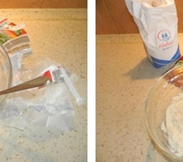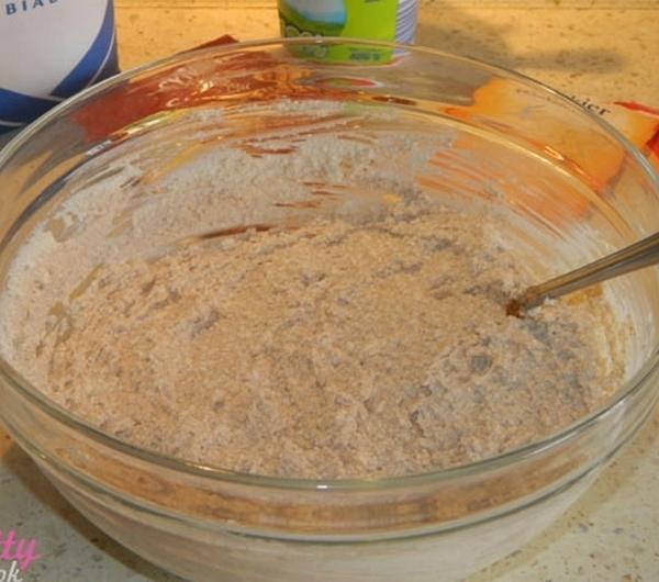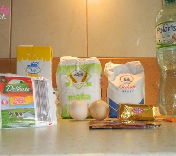 Teraz farsz – odpakowujemy ser i rozdrabniamy – „dziubiemy” go widelcem. Z tego co wiem, niektóre moje koleżanki mielą go przez maszynkę, by pozbyć się wszystkich grudek – mnie osobiście one nie przeszkadzają (biały ser to biały ser;) ). Wbijamy jedno żółtko i słodzimy do smaku. Dodajemy jedną płaską łyżeczkę cynamonu – płaską! Ostrzegam, bo mnie się „sypnęła” lekko czubata i smak cynamonu był za bardzo intensywny. Wszystko razem mieszamy, by uzyskać jak najbardziej jednolitą i gładką konsystencję.