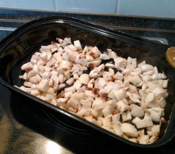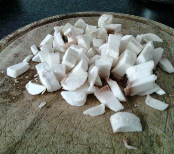 1. Pieczarki obieramy, kroimy w kostkę i dusimy z odrobiną oleju
