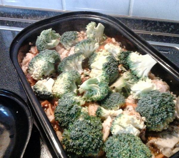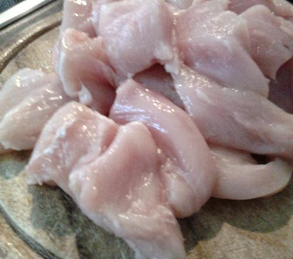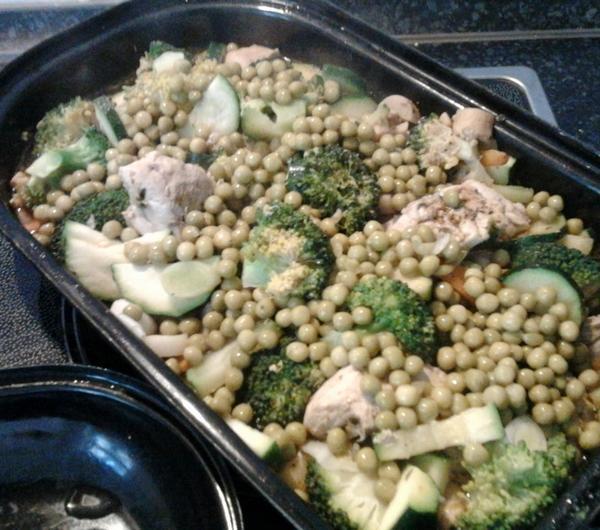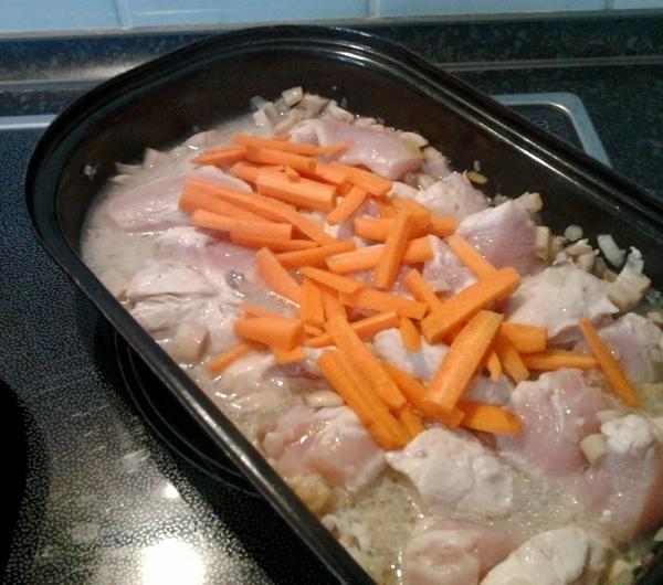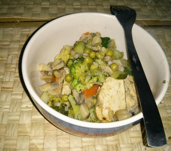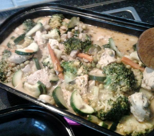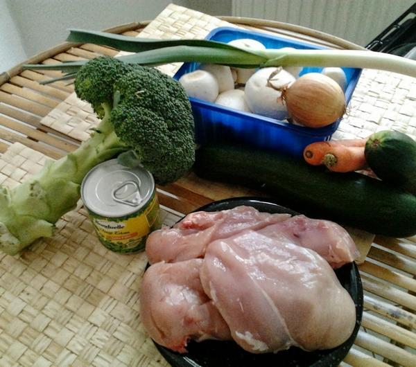 PRZEPIS:Składniki:0,5 kg piersi z kurczakaokoło 5-6 pieczarek1 cebula1 cukinia średniej wielkości2 małe marchweki1 brokuł200 g groszku1 por (mały)1 ząbek czosnkuśmietanka ryżowa (można zastąpić śmietaną do sosów)pieprz, słodka papryka i sól