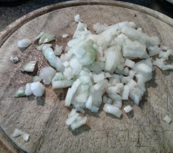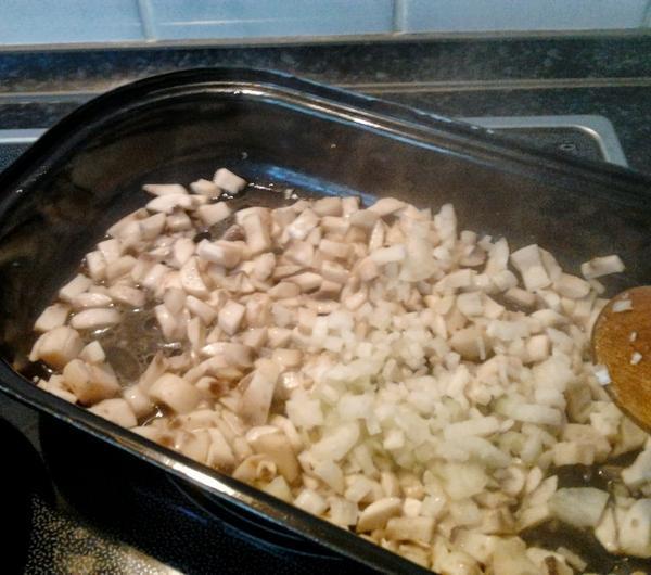 2. Cebulę kroimy w kostkę i dorzucamy do pieczarek. Razem dusimy na małym ogniu