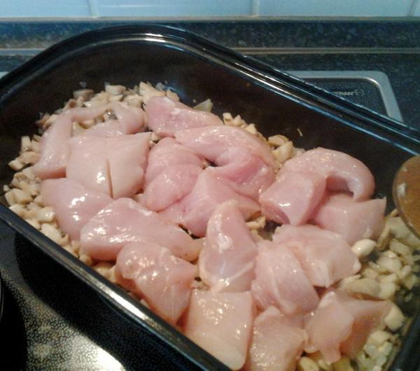 4. Mięso kroimy w duże kawałki i dodajemy do pieczarek, dusimy na małym ogniu, podlewając wodą.