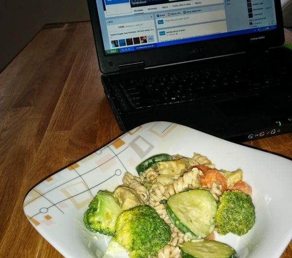 PRZEPIS:Składniki:400 g piersi z indyka300 g makaronu razowego1 brokuł1 cukinia1 cebula3 małe marchewki100 ml śmietany sojowej1 łyżka masła naturalnego1 łyżka sosu sojowego1 łyżeczka czerwonej pasty curryszczypta soli, pieprzu czarnego mielonego i ziół prowansalskich1. Pierś kroimy w kostkę i macerujemy w sosie sojowym, pieprzu i ziołach. Odstawiamy na co najmniej 15 minut.2. Gotujemy makaron (pamiętajmy, aby był al dente)3. Kroimy warzywa4. Do woka lub garnka wrzucamy mięso, podlewamy 2 łyżki wody i dusimy pod przykryciem.5. Dorzucamy cebulę i pastę curry.6. Ja mięso jest już "gotowe" dodajemy warzywa i dusimy pod przykryciem, aż będą wpół twarde.7. Dolewamy śmietany i ewentualnie dodajemy masła. Chwilę dusimy, pilnując, aby warzywa nie były zbyt miękkie.8. Mieszamy z makaronem, doprawiamy do smaku....i GOTOWE !!!
