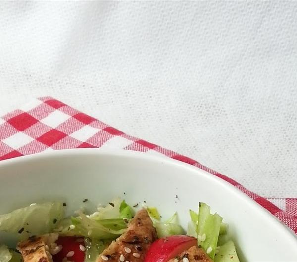 PRZEPIS:Składniki:600 g piersi z kurczaka0,5 sałaty lodowej0,5 papryki1 ogórekrzodkiewki około 5-6 sztukgarść orzechów (migdały i nerkowce)sezammąka kukurydzianajajopieprz, zioła prowansalskie