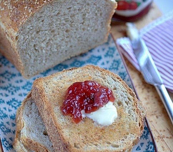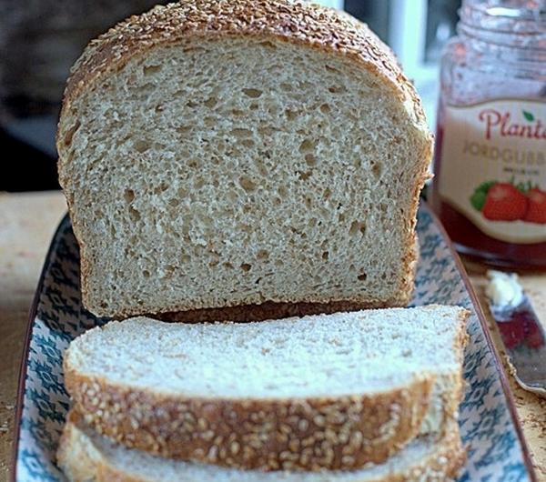 Przepis na chleb na chleb tostowy z sezamemSkładniki: na dwie podłużne formy o wymiarach 15 cm x 30 cm40 g świeżych drożdży500 – 550 ml wody zimnej, ilość w zależności od mąki800 g pszennej mąki150 g graham mąki2 łyżeczki soli3 łyżki melasy lub miodu3 czubate łyżki tahini1 żółtko + 1 łyżka mleka3 łyżki sesamu do posypaniaWykonanie:Rozpuść drożdże w wodzie z melasą. Dodaj obie mąki, tahini i zagnieć elastyczne ciasto. Ugniataj ciasto przez 5 minut, ja za pomocą robota i dodaj sól. Wyrabiaj chleb jeszcze przez 10 minut. Jeśli zaczynają się tworzyć nitki glutenu, ciasto na chleb jest już dobrze wyrobione.Przykryj ciasto folią spożywczą i odstaw do wyrośnięcia na 40 minut. Wyjmij na stolnicę i złóż kilka razy. Włóż z powrotem do miski i przykryj folią. Niech ciasto odpocznie przez 10 minut.Dwie podłużne formy wysmaruj olejem i oprósz otrębami. Podziel ciasto na dwie równe części, uformuj 2 bochenki i włóż do foremek. Przykryj folią i pozostaw do wyrośnięcia na 30 minut.Posmaruj wierzch chleba rozmąconym w mleku żółtkiem i posyp sezamem. Piecz chleb na 250ºC (termoobieg) przez 15 minut. Zmniejsz temperaturę do 225ºC i piecz jeszcze przez 15 minut. Wyjmij z piekarnika, ostudź i pokrój na kromki.