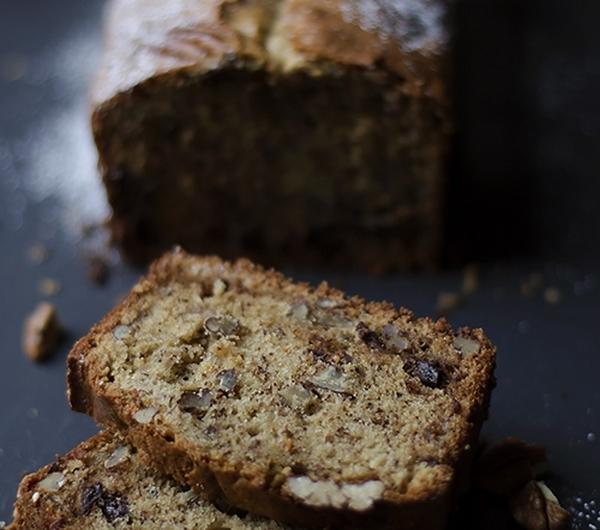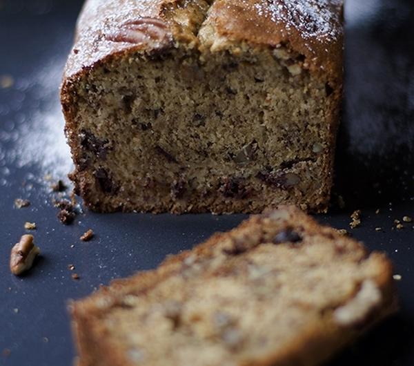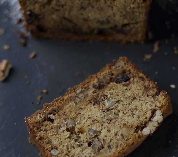Zmiksuj cukier z jajkami na puszysto. Dodaj olej, mleko i miksuj dalej. Zgnieć banany widelcem i wymieszaj z jajeczną masą. Wymieszaj mąkę z sodą, cynamonem, czekoladą i orzechami (20 g całych orzechów zostaw do dekoracji). Wymieszaj teraz delikatnie masę jajeczną z suchymi składnikami. Foremkę wysmaruj tłuszczem i posyp mąką. Przełóż masę do foremki i wygładź powierzchnię. Powciskaj resztę orzechów. Piecz ciasto na 175ºC na termoobiegu przez 40 minut. Upieczone ciasto ostudź w foremce.