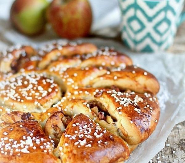 Składniki:400 g mąki pszennej15 g świeżych drożdży200 – 250 ml mleka1 jajko80 g cukru50 g masła, stopionego½ łyżeczki soli3 jabłka80 g orzechów, u mnie pekan1 łyżka masła1 łyżeczka cynamonu3 łyżki brązowego cukruDodatkowo1 jajko1 łyżka mleka2 łyżki perlistego cukruWykonanie:Podgrzej mleko i rozpuść w nim drożdże i cukier. Dodaj mąkę i zacznij zarabiać ciasto. Kiedy już wszystkie składniki się połączą dodaj sól i roztopione masło. Wyrób elastyczne, puszyste ciasto, przykryj folią i pozostaw do wyrośnięcia na około 40 minut.W tym czasie przygotuj nadzienie. Obierz jabłka i pokrój w kostkę. Podsmaż jabłka na maśle z dodatkiem cukru i cynamonu. Pod koniec dodaj grubo posiekane orzechy. Ostudź nieco nadzienie.Wyrośnięte ciasto drożdżowe podziel na dwie równe części i rozwałkuj na placki o średnicy 25 cm. Ułóż pierwszy placek na blasze pokrytej pergaminem. Rozprowadź na nim nadzienie, ale pozostaw brzeg o grubości 2 cm. Posmaruj brzeg jajkiem. Następnie przykryj nadzienie drugim plackiem, lekko dociskając.Umieść na środku wieńca kubek czy szklankę o średnicy 10 cm i rozetnij ciasto na 10 pasków, tzn. od brzegu szklanki do brzegu ciasta. Teraz każdy nacięty pasek odwróć raz, wszystkie w tym samym kierunku. Posmaruj wieniec jajkiem i posyp perlistym cukrem. Pozostaw do wyrośnięcia na 30 minut.Piecz ciasto w piekarniki nagrzanym na 160ºC (termoobieg) przez około 25 minut.