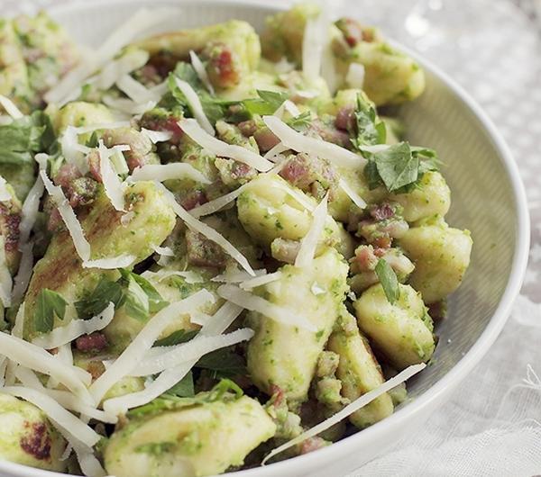 Z podanych składników na kopytka zagnieć ciasto, podziel na 4 porcje i uformuj rulony. Pokrój rulony na małe kawałki- kopytka i ugotuj w lekko osolonej wodzie. Wyjmij cedzakową łyżką i ułóż na opłukanym zimną wodą talerzu.Ugotuj groszek w lekko osolonej wodzie, odcedź i opłucz zimną wodą. Przełóż do blendera, dodaj resztę składników na pesto i zmiksuj. Jeśli pesto jest za gęste dodaj więcej oliwy lub wody.Podsmaż kopytka na patelni lub jeszcze ciepłe wymieszaj z pesto. Podaj kopytka z zrumienionym i pokruszonym boczkiem, utartym parmezanem i posypane natką.Polecane przepisyKopytka ziemniaczane z twarogiemNo i mamy listopad!Włoskie gnocchi z gulaszem StroganoffPrawie tradycyjne knedle ze śliwkamiBoeuf Bourgignon – przepis 2