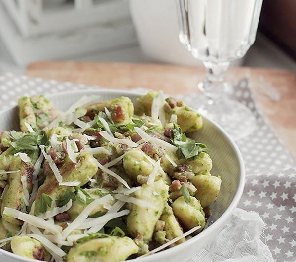 Przepis na kopytka z groszkowym pesto, boczkiem i parmezanemSkładniki: na 5 porcjiKopytka½ kg ugotowanych ziemniaków1 jajko300 – 400 ml pszennej mąkiPesto z zielonego groszku150 g zielonego groszku, u mnie mrożony2 ząbki czosnku4 łyżki posiekanej natki pietruszki2 łyżki utartego parmezanusól do smakuokoło 150 ml dobrej oliwyDodatkowo200 g wędzonego boczku, pokrojonego w cienkie plastry50 utartego parmezanunatka pietruszki do posypania