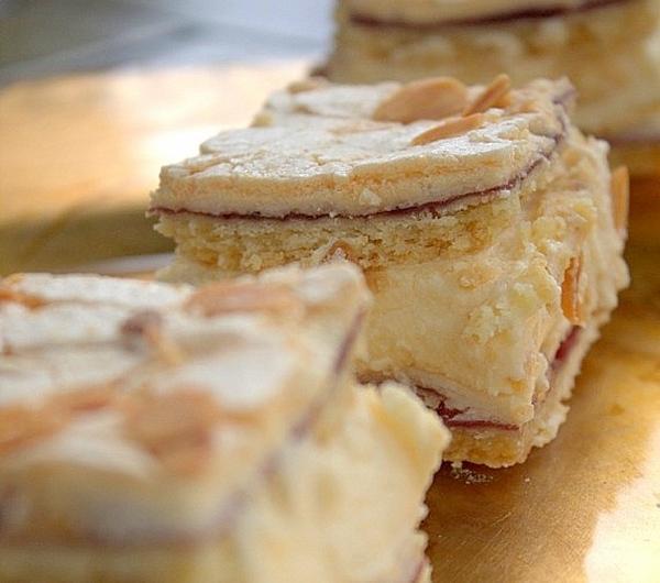 Krajanka kremowa Pani WalewskaSkładniki:Kruche ciasto500 g mąki1 ½ łyżeczki proszku do pieczenia100 ml cukru pudru250 g masła3 żółtka2 łyżki zimnej wodysłoik dżemu z czarnej porzeczkiBeza6 białek375 ml cukru pudru1 łyżka mąki ziemniaczanej100 g posiekanych migdałówKrem maślany z Amaretto½ l mleka3 łyżki mąki2 łyżki mąki ziemniaczanej2 żółtka100 ml cukru1 łyżka extraktu waniliowego200 g masła, miękkiego2 msk likieru amarettoWykonanie:Posiekaj zimne masło z mąką i cukrem. Dodaj proszek do pieczenia, żółtka, zimną wodę i połącz delikatnie palcami, nie ugniataj. Jeżeli kruche ciasto jest pożądnie zagniecione, będzie zbite po upieczeniu. Owiń ciasto w folię i włóż do lodówki na 30 minut.W międzyczasie ubij pianę z białek na sztywno. Pod koniec ubijania dodaj stopniowo cukier i mąkę ziemniaczaną.Wyjmij kruche ciasto z lodówki i podziel na dwie równe części. Rozwałkuj na 2 placki o wielkości 25 cm x 30 cm. Posmaruj oba placki dżemem i rozprowadź ubitą pianę. Posyp posiekanymi migdałami. Jeśli masz piekarnik z termoobiegiem możesz piec oba spody na raz. W przypadku jego braku piecz spody oddzielnie. Zaczekaj też z nałożeniem dżemu i piany na drugi spód. Zrób to przed samym pieczeniem. Piecz spody na 175ºC na termoobieg przez 30 minut. Bez termoobiegu możesz podnieść temperaturę do 200ºC i piec przez 20-25 minut każdy spód oddzielnie.Ugotuj waniliowy krem. Połowę mleka i cukier zagotuj. Resztę mleka wymieszaj trzepaczką z żółtkami i obiema mąkami i dodaj do gorącego mleka cały czas mieszając, dopóki krem nie zgęstnieje. Zdejmij krem z ognia i ostudź.Utrzyj miękkie masło na puszysto. Podczas ucierania dodawaj po łyżce waniliowego kremu, a na końcu dodaj likier.Rozprowadź krem maślany na wierzchu spodu i przykryj drugim spodem, lekko dociskając. Wstaw do lodówki na kilka godzin. Ciasto będzie kruche i łatwe w krojeniu.