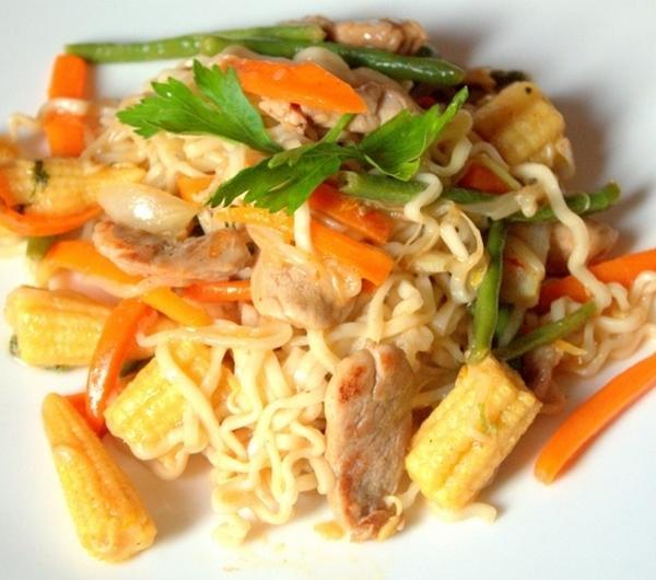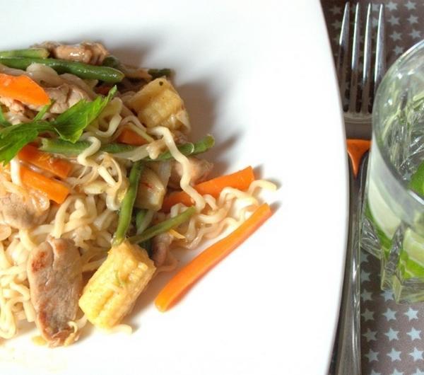 Szybko, szybko, szybko… uwielbiam takie szybkie obiady. Za nim otworzyłam lodówkę nie miałam pojęcia co ja dziś zrobię na obiad. W zamrażalce odkrywam kawałek polędwicy wieprzowej, trochę mrożonej fasolki… a w kuchennej spiżarni puszki z kiełkami i mini kukurydza oraz nudle .