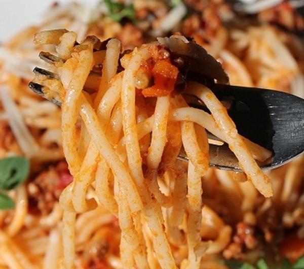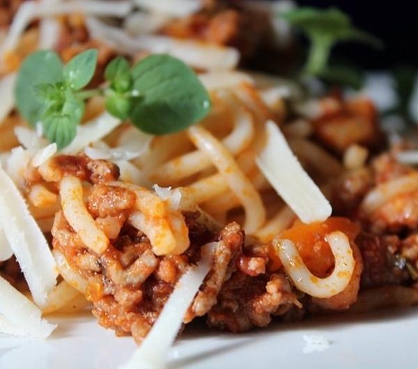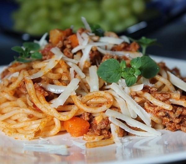 Prawdziwe spaghetti bolognese zawiera zawsze marchewkę i seler. Moje dzisiejsze spaghetti dosmakowałam czerwonym winem i utartą gałką muszkatałą. Zamiast bazylii postanowiłam przyprawićsos suszonym oregano. Użyłam również prawdziwego włoskiego boczku, pancetta.