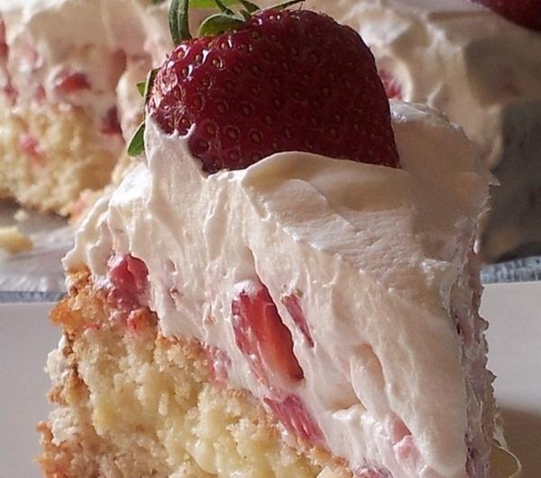 Mam sprawdzony przepis na naprawdę dobry tort z truskawkami o ile lubicie bitą smietanę i waniliowy krem. Biszkopt i krem waniliowy są oczywiście domowej roboty . Lubię piec ten biszkopt również do innych tortów, bo jest on puszysty i wilgotny.Składniki:Biszkopt3 dl cukru1 dl wrzątku2 ½ dl mąki3 jajka1 ½ łyżeczki proszku do pieczeniaKrem waniliowy2 ½ dl mleka2 ½ łyżeczki mąki ziemniaczanej3 łyżki cukru2 żółtka2 łyżeczki cukru waniliowego500 g świeżych truskawek3 dl śmietany kremówkiWykonanie:Ubij jaja i cukier na puszystą masę. Wlej wrzącą wodę podczas ubijania i ubijaj jeszcze przez minutę.Wymieszaj proszek do pieczenia i mąkę i przesiane dodaj do jaj. Delikatnie wymieszaj.Wlej ciasto do tortownicy o średnicy 26 cm, wysmarowanej tłuszczem i posypanej mąką .Piecz biszkopt w 175 º C (termoobieg), około 30 minut.Po upieczeniu niech biszkopt dobrze ostygnie.Tymczasem ubij lekko mleko z mąką ziemniaczaną, żółtkami i cukrem. Zacznij podgrzewać, cały czas ubijaj, aż krem zacznie gęstnieć. Zdejmij z ognia. Kiedy krem ostygnie wymieszaj go z cukrem waniliowym.Ubij śmietanę. Pokrój truskawki, a kilka w całości zostaw do przybrania.Przekrój biszkopt na pół. Pierwszy placek posmaruj kremem waniliowym i przykryj drugim plackiem.Wymieszaj część śmietany z truskawkami i rosmaruj równomiernie na powierzchni tortu, a następnie resztę bitej śmietany i udekoruj świeżymi truskawkami.