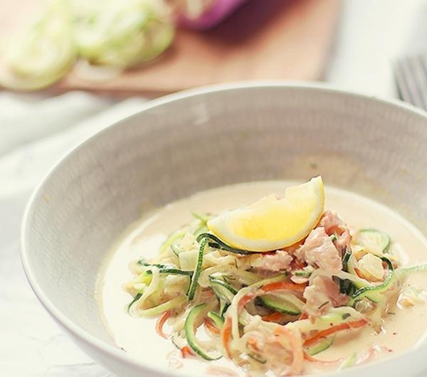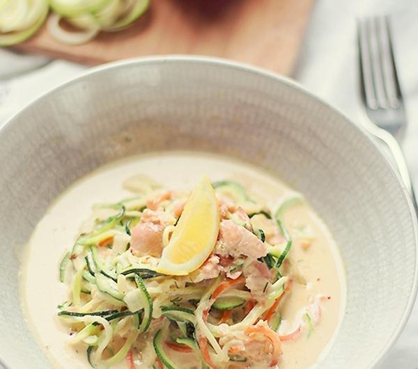 Dawno nosiłam się z zamiarem kupienia veggie twister, proste, sprawne urządzenie za, pomocą którego można wycinać spaghetti z warzyw. Dzisiaj przygotowałam dla Was i i marchewki i muszę się przyznać, że się zakochałam. Spaghetti wyszły super i można je jeść nawet na surowo, ale dzisiaj zrobiłam spaghetti z sosem na ciepło, szybki obiad w 30 minut (bez stresu) Takie warzywne spaghetti można również wymieszać z tradycyjnym spaghetti z mąki.Warzywne spaghetti z sosem z łososiaSkładniki: na 2 porcje1 zielona cukinia średnie wielkości1 marchewka1 mała cebula2 ząbki czosnku, u mnie grillowany1 łyżka posiekanego kopru1 łyżeczka sambal oelek (lub 1 świeża chili)250 g śmietanki2 łyżki creme fraiche, czubate1 łyżka masła150 g wędzonego łososiasól do smaku
