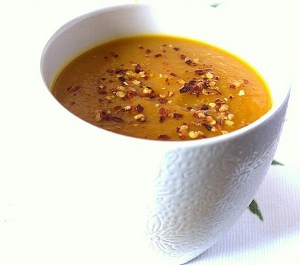 Dzisiejsza zupa z dyni to zupa wegetariańska ugotowana na warzywnym bulionie. Oczywiście nic trudnego ugotować zupę dyniowa na bulionie z mięsa… Zupa ma lekko wyczuwalny smak jabłka, imbiru i ostrej żółtej curry w proszku. Dla odważnych posypałam zupę rozgniecionymi płatkami wędzonej chili. Oto przepis:Zupa dyniowa krem z imbiremSkładniki:800 g dyni, pieczonej1 duża cebula2 jabłka2 cm świeżego imbiru2 łyżeczki curry w proszku3 łyżki oliwy1½ l bulionu, warzywnegosól do smakuwedzone płatki chili do posypania, opcjonalnieWykonanie:Cebule i imbir obierz i pokrój w kostkę. Usuń nasiona z jabłek i ze skórką pokrój w kostkę. Podsmaż na oliwie posypując curry. Dodaj pokrojoną, pieczoną dynię.Zalej całość bulionem i gotuj 10 minut.Do zupy można również wykorzystać świeżą dynię, wtedy okres gotowania będzie trochę dłuższy.Zmiksuj zupę w blenderze i wlej z powrotem do garka, podgrzej. Dopraw zupę solą i ewentualnie chili.Polecane przepisyMinestrone z dynia i jarmuzemZupa wegetariańska z czarnej fasoliZupa kalafiorowa po azjatyckuZupa meksykańska z quinoaPomidorowka z szypulkami