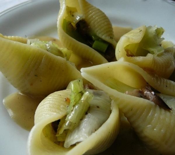 Duet pora z pieczarkami to jedno z moich ulubionych połączeń smakowych, toteż kiedy zastanawiałam się nad nadzieniem do makaronu muszle, od razu przyszedł mi do głowy. Duszone pieczarki mam często w lodówce, bo prawie co tydzień kupuję na targu sporą porcję, duszę na oleju , trzymam w lodówce i wykorzystuję jako dodatek do drugiego dania, zup i sosów, jak mi są potrzebne.Pora tym razem przygotowałam w mikrofalówce, bo lubię smak warzyw przygotowanych w ten sposób – jest esencjonalny, nie ulatnia się w powietrze czy do wody, jak te przygotowane w garnku czy na patelni. Do tego zrobiłam sos delikatnie pieczarkowy, z dodatkiem wywaru z duszonych pieczarek , bulionu warzywnego i ziół.opakowanie makaronu Conchiglioni ( miałam Lubelli)kubek duszonych pieczarekduży por bez zielonych końcówekoliwasól ziołowa, pieprz z młynkakolendra mielona1/2 szklanki wywaru z pieczarekszklanka bulionu warzywnegozasmażka z 2 łyżek oleju i łyżki mąkiMakaron gotujemy według przepisu na opakowaniu, odcedzamy, hartujemy zimną wodą.Pora ( białą i jasnozieloną część) pokroiłam w plasterki, dodałam łyżkę oliwy i dwie wody, wstawiłam do mikrofalówki na 8 minut na 600 W. Po wyjęciu doprawiłam solą i pieprzem z młynka. Można go też po prostu zeszklić na patelni. Pieczarki były już doprawione, odcedziłam je i pokroiłam niezbyt drobno, wymieszałam z porami. Napełniłam farszem muszelki za pomocą łyżeczki.Z oleju i mąki zrobiłam rumianą zasmażkę, rozprowadziłam ją bulionem warzywnym i intensywnie mieszając zagotowałam . Dodałam wywar z pieczarek, doprawiłam solą ziołową, pieprzem z młynka i mieloną kolendrą. Polałam sosem nadziane muszle.Bardzo to wszystko razem harmonijnie smakowało, lekko zeszklone pory z duszonymi pieczarkami w muszelkach, do tego sosik – niebo w gębie.Smacznego !