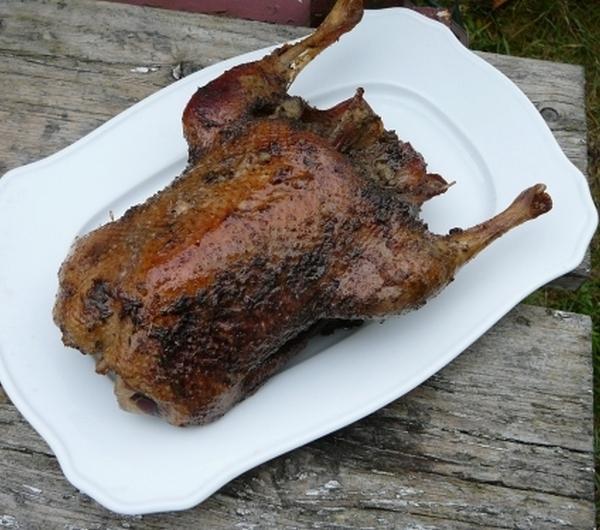 Napisałam – prawie dziwaczka, bo sprawiła mi niespodziankę. Planowałam upiec kurczaka na butelce piwa i poprosiłam męża o kupienie niedużego kurczaka, bo taki lepiej się piecze. Rozwijam opakowanie i widzę – coś takie długie skrzydełka, płaska pierś, zbyt długa szyja… Wołam do męża – to nie kurczak, to kaczka. A on protestuje święcie przekonany, że kupił kurczaka. Otóż tak się zasugerował szukaniem ptaka odpowiedniej wagi, że nie zwrócił uwagi na napis na opakowaniu, gdzie jak byk było napisane – kaczka ! Ja też zasugerowana kurczakiem nawet na ten napis nie zerknęłam. I tak powstał improwizowany przepis na pieczoną faszerowana kaczkę. Wyszło na dobre, bo do marynaty otworzyliśmy butelkę czerwonego wina i potem je do tej kaczki popijaliśmy . Taka to była dziwaczka !kaczka ( może być mała, ja taką miałam)marynata : czerwone wino, oliwa, sól, pieprz, tymianek, majeranekfarsz : 3/4 szklanki gotowanego ryżu, 3 wątróbki z kurczaka, cebula, sól, pieprzrosół do podlewaniaKaczkę natarłam solą, potem oliwą i winem i posypałam przyprawami, włożyłam do lodówki na pół godziny.Wątróbki udusiłam z cebulą, rozdrobniłam, wymieszałam z ryżem i doprawiłam. Farszem nadziałam kaczkę, włożyłam do piekarnika, skropiłam winem i rosołem. Piekłam w 180 c na około 1, 5 godziny. W międzyczasie ją skrapiałam winem i rosołem, potem wytworzonym sosem.Kaczka- dziwaczka , niespodziewana okazała się bardzo smaczna. Winna marynata nadała jej ciekawy smak, z wierzchu była chrupiąca a w środku soczysta. Farsz też pasował. Najważniejsze, że z tą niespodzianką sobie poradziłam.Smacznego !