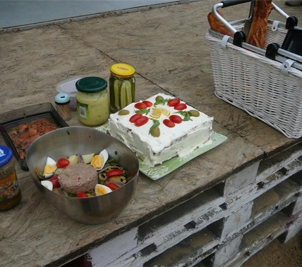 Nie zabrakło też przetworów z domowej spiżarni –to dżemy najmłodszej blogowiczki Karmelitki i Kasi oraz konserwowe ogórki naszego rodzynka San Jacinto . Ten ostatni zaprezentował typową męską kuchnię z tortem kanapkowym , sałatkami i śledziami w curry.