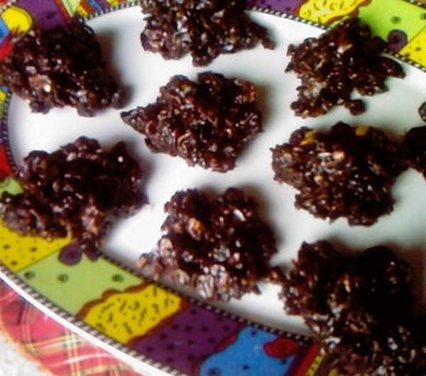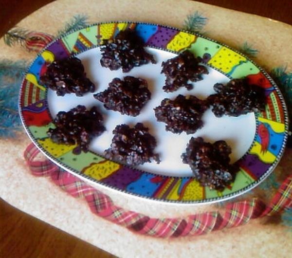 Te słodycze znam z czasów kartkowej czekolady. Cokolwiek przypominającego w smaku czekoladę było na wagę złota. Szyszki robi się z domowej polewy czekoladowej, bakalii i płatków owsianych. Ja dodaję jeszcze płatki kukurydziane – mają ciekawszy smak i fakturę.Moim dzieciom , wychowanym w czasach czekoladowego zawrotu głowy, mimo to bardzo smakują, toteż robimy je dość często.Myślę, że spokojnie można nimi obdarować znajome dzieci…½ kostki masła lub dobrej margaryny½ szklanki cukru¼ szklanki mleka2-3 łyżki kakaookoło szklanki płatków owsianych i kukurydzianychbakalie – ile i jakie kto lubi, wiórki kokosowe mile widzianearomat rumowy ( opcjonalnie)Rozpuszczamy masło, mleko i cukier, gdy jest ciepłe, dodajemy kakao i dokładnie mieszamy. Gotujemy kilka minut na małym ogniu. Zdejmujemy, dodajemy bakalie, aromat i tyle płatków, aby masa była gęsta. Formujemy łyżką nieregularne „szyszki” i układamy na natłuszczonym talerzu do zastygnięcia – najpierw w temperaturze pokojowej, potem można je trzymać w lodówce.Są plastyczne, więc spokojnie można przez nie przedziać igłę z nitką do zawieszenia na choince. Jeśli do tego dotrwają… Smacznego!