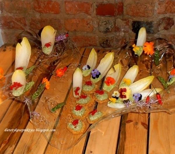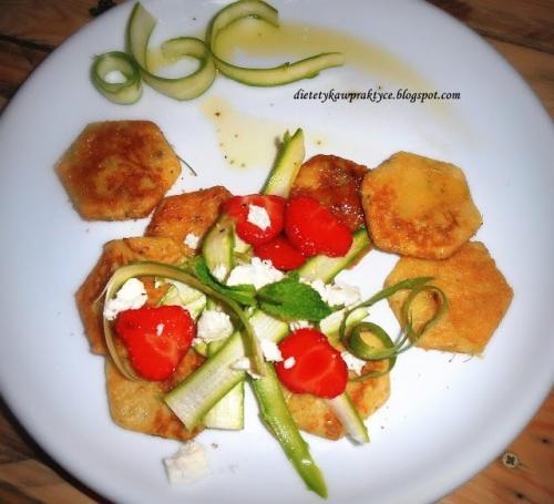 A praktykowane również przeze mnie placuszki z kwiatów czarnego bzu zostały podane z paskami surowych szparagów , truskawkami i kozim serem.