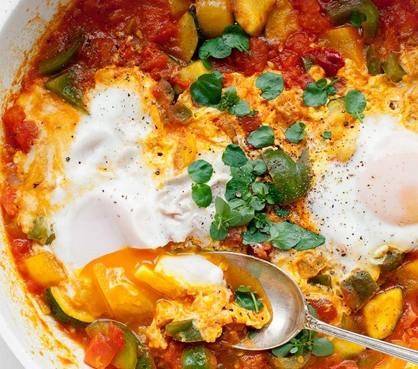 Składniki2 porcje2 łyżeczki oliwy extra vergine1/2 małej cebuli1/2 ząbka czosnkukawałek papryczki chili (bez pestek) lub ostra papryka w proszku150 g cukinii (ok. 1/3 średniej)1/2 papryki (zielonej, żółtej lub czerwonej)500 g pomidorówmalinowych (ok. 3 średnie)sól i świeżo mielony pieprz2 jajkaPrzyprawy:1/4 łyżeczki mielonej kurkumy1/4 łyżeczki garam masala (polecam, ale jeśli nie mamy można dodać szczyptę mielonego kminu rzymskiego)Do podania:listki świeżej kolendry / rukwii wodnej / bazyliiPrzygotowaniePrzygotować warzywa: cebulę posiekać, czosnek i chili drobno posiekać, cukinię i paprykę umyć i pokroić w kostkę. Pomidory sparzyć wrzątkiem, obrać i pokroić w kostkę.Na patelni (o śr. ok. 25 cm) rozgrzać 1 łyżeczkę oliwę i zeszklić cebulę, dodać czosnek i chili i chwilę podsmażyć. Włożyć cukinię i paprykę, dodać drugą łyżeczkę oliwy i smażyć mieszając przez ok. 2 - 3 minuty. W międzyczasie posolić aby warzywa zmiękły oraz dodać przyprawy aby uwolnić ich aromat podczas podsmażania.Dodać pomidory, posolić i doprawić pieprzem. Wymieszać i smażyć ok. 4 - 5 minut mieszając od czasu do czasu.Do potrawy wbić jajka (uważając aby nie naruszyć żółtka), przykryć i gotować pod przykryciem ok. 3 minuty aż białko się zetnie a żółtko pozostanie ciągle płynne. Podawać posypując listkami kolendry / rukwii wodnej / bazylii.