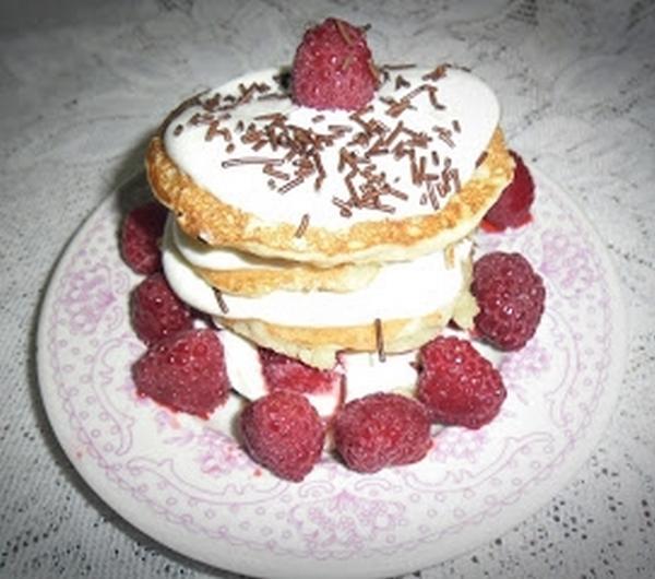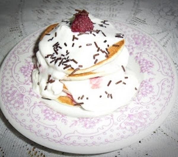 cukrem pudrem i usztywniaczem.Upieczone pancakes smarować ubitą kremówką, na to kłaść