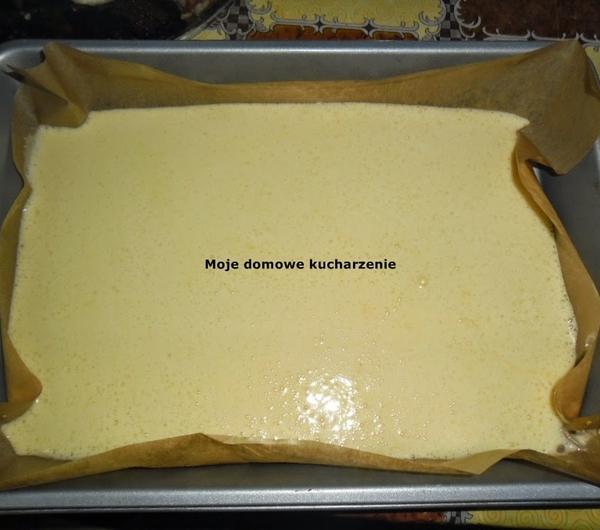 proszkiem do pieczenia i dodać do masy jajecznej. Wszystko dokładnie wymieszać.Wylać na wysmarowana tłuszczem blaszkę.Piec 25 min. w temp. 180 stopni C.