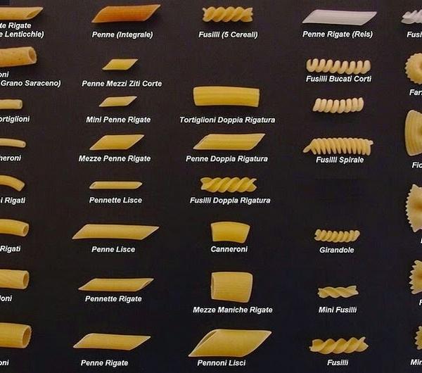 źródło: http://bit.ly/16UhINuPenne - rurki ; nadają się do gęstych sosów np. serowych lub pomidorowych jak neapolitano czy bolognese, wszelkiego rodzaju zapiekanek i zup;Fusilli - świderki ; nadają się do makaronowych sałatek, gęstych sosów i zup;Farfalle - kokardki ; nadają się do sałatek, pesto, wszystkich rodzajów sosów i do zup.Linguine - cienkie wstążki, "płaskie" spaghetti ; nadaje się do sosów na bazie oliwy z oliwek, sosów alfredo i innych sosów;Spaghetti - spaghetti ; nadaje się do sosów na bazie oliwy z oliwek i masła, a także gęstych sosów.Tagliatelle - gubsze wstążki ; nadaje się do sosów śmietanowych, na bazie białego wina i oliwy z oliwek;Fettuccine - gniazda ze wstążek ; nadaje się do wszelkiego rodzaju sosów;Conchigliette - makaron muszelki ; duże nadają się do nadziewania i zapiekania, mniejsze do sałatek, zup i makaronów typu mac & cheese;Orzo - makaron w kształcie ryżu ; nadaje się do zagęszczania zup, sałatek makaronowych, sosów na bazie białego wina;Cannelloni - grube, duże rurki ; nadaje się do nadziewania i zapiekania;Lasagna - lazania (płaty); nadaje się do przekładanych zapiekanek z dowolnym farszem;Tortellini - pierożki tortelini ; najczęściej kupuję gotowe ze szpinakiem, ricottą lub pomidorami;