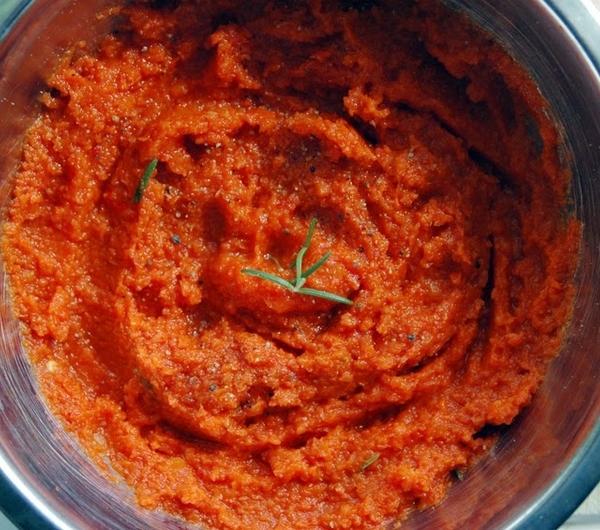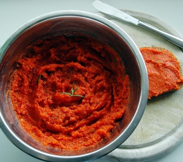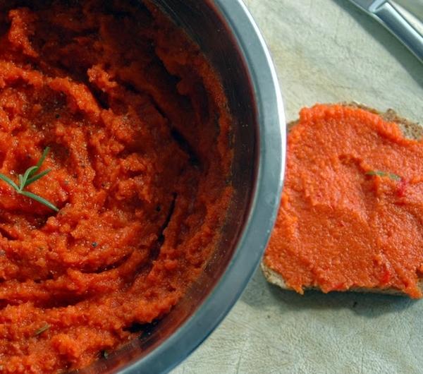 Pasta kanapkowa z pieczoną papryką i pieczoną marchewkąSkładniki:3 marchewki obrane,2 czerwone papryki,sok z 1/4 cytryny,1/2 łyżeczki słodkiej papryki w proszku,1/2 ostrej papryki w proszku,szczypta wędzonej papryki,szczypta mielonego kminu rzymskiego,gałązka rozmarynu drobno posiekana,łyżka oliwy z oliwek,sól do smaku.