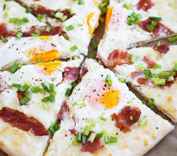 Składniki (1 pizza o średnicy 30 cm):- ciasto:1 szklanka mąki (+ do wyrabiania ciasta)6 g świeżych drożdży (lub 0,5 łyżeczki suszonych)niepełna łyżeczka cukruniepełna łyżeczka soli100 ml ciepłej wody (domieszałam odrobinę mleka)2 łyżki oliwy-dodatki:1-2 łyżki kwaśnej śmietany3 plasterki boczku usmażone na rumiano i chrupkokulka mozzarelli3 jajkacebula dymkasól, pieprzPrzygotowanie:Ciasto najlepiej przygotować poprzedniego dnia wieczorem i przechować w lodówce do rana. W misce wymieszaj mąkę i sól. Do mniejszego naczynia wkrusz drożdże, posyp cukrem i zalej ciepłą (nie gorącą) wodą, poczekaj paręnaście minut aż drożdże zaczną pracować. Następnie zrób wgłębienie w mące i wsyp drożdżowy zaczyn, dodać oliwę. Mieszaj łyżką, a kiedy ciasto będzie w miarę zwarte, przełóż na posypany mąką blat blat i wyrabiaj dłonią ok 10 minut. Przyznam, że czasem, kiedy mam lenia biorę mikser ze spiralną końcówką i większość wyrabiania załatwia za mnie właśnie on. Ciasto powinno być gładkie i sprężyste. Pozostaw je w misce, przykryj ściereczką i pozwól wyrastać do 1 godziny. Jeśli przygotowujesz ciasto dzień wcześniej, to możesz przechować je w większym woreczku na mrożonki pozostawiając nieco miejsca na rosnące wciąż ciasto. Na drugi dzień wyjmij ciasto z lodówki i rozwałkuj na okrąg około 30 cm. Ja ostatnio robię to na papierze do pieczenia, który potem wraz z pizzą przekładam na rozgrzaną blachę, ale wymaga to nieco wprawy. Możesz dodawać przybranie już po rozłożeniu ciasta na blasze. Rozgrzej piekarnik do temperatury 230'C. Na rozwałkowanym placku rozsmaruj cienką warstwą śmietanę, następnie rozsyp tartą mozzarellę. Ja przy okazji tego kroku formuję trzy miejsca na jajka, gdzie sera jest nieco mniej. Następnie dodaj boczek i wbij jajka. Posyp pieprzem i solą. Piecz w dobrze nagrzanym piekarniku około 10 minut (u mnie 13). Upieczoną pizzę posyp posiekaną dymką. M m m ! Smacznego życzyć nie muszę.