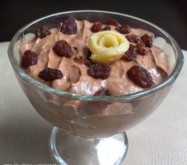 rodzynkami, jak mamy jeszcze miejsce w pucharku jeszcze raz wyłożyć mus. Przykryć folią spożywczą i wstawić do lodówki na około 1-2 godziny. Przed podaniem udekorować. Ja posypałam