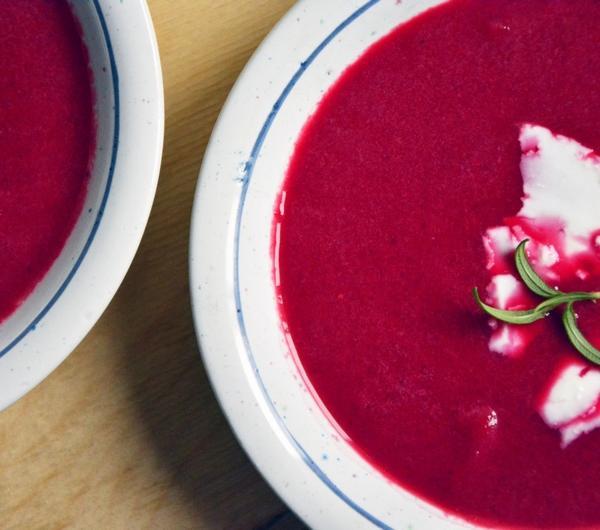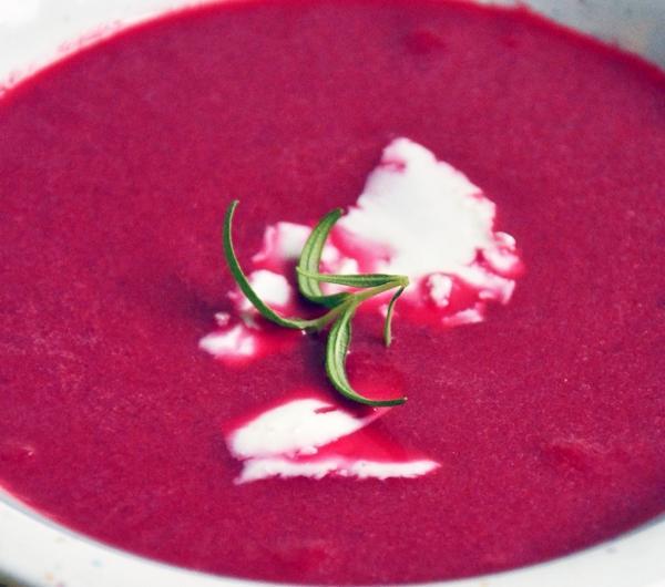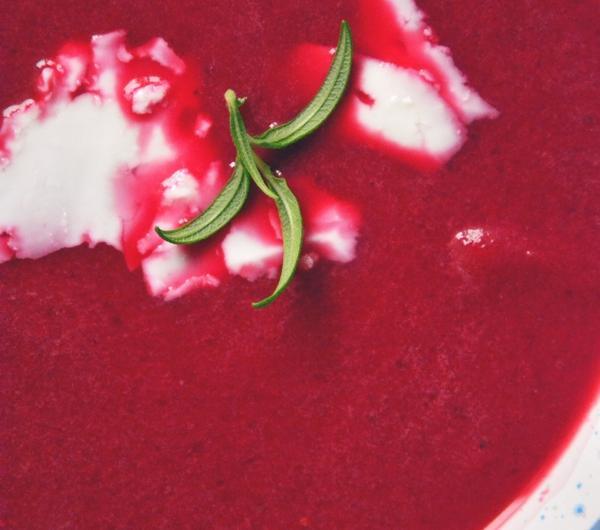 Składniki– 3 spore buraki– 2 ząbki czosnku– około 1l bulionu drobiowego/warzywnego– szczypta rozmarynu– sól i pieprz do smaku– cukier do smaku– 3 łyżki śmietany 18%– rozmaryn do dekoracji– ser kozi, jako dodatekBuraki kroimy w grubą kostkę, zalewamy bulionem (taka ilość, aby pokryła warzywa), dodajemy czosnek, rozmaryn i gotujemy około 40 minut. Kiedy buraki będą miękkie, zdejmujemy z ognia i blendujemy je na gładką masę. Dodajemy do śmietanę, powoli, małymi partiami dodając ją do zupy, nieustannie mieszając. Doprawiamy solą, pieprzem oraz cukrem. W zależności od upodobań, możemy dodać innych przypraw. Zagotowujemy.Podajemy z kawałkami koziego sera.