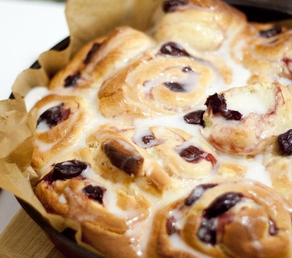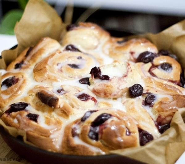 Były już kajzerki i bułki hamburgerowe, przyszła więc pora na coś słodkiego. Znalazłam zatem przepis na drożdżowe bułeczki-ślimaczki z owocami. Do bułeczek potrzebne będą mrożone owoce, w oryginalnym przepisie były to maliny, ja użyłam czereśni, których jeszcze sporo zostało mi z wakacyjnych zapasów, ale myślę, że wiśnie byłyby lepsze, ze względu na bardziej wyrazisty smak. Z podanej ilości składników wychodzi 16 bułeczek, co w moim przypadku dało 2 okrągłe blaszki. Jeśli jesteście też szczęśliwymi posiadaczami miksera z hakiem do ciasta drożdżowego, będzie Wam o wiele łatwiej. Oryginalny przepis tutaj .Co nam będzie potrzebne:Ciasto:– 1 szkl. mleka– 2/3 szkl. cukru– 2 paczki drożdży instant (14g) lub 30 g świeżych– 125g niesłonego masła– 2 jajka– 1/4 łyżeczki soli– ok. 4,5 szkl. mąkiNadzienie:– 2 szklanki mrożonych owoców (malin, truskawek, wiśni lub czereśni – byle bez pestek)– 1 łyżka mąki ziemniaczanej– 1/4 szkl. cukruLukier:– 1 szklanka cukru pudru– pół łyżki masła rozpuszczonego masła– 2 łyżki mleka ciepłego mlekaPrzygotowanie:Mleko podgrzać lekko, ma być letnie i nie za gorące, masło roztopićCiepłe mleko przelać do miski, dodać drożdże i cukier, wymieszać, przykryć czystą ściereczką i odstawić na 5 min (jeśli używacie świeżych drożdży trzeba najpierw zrobić zaczyn – 2 łyżki mąki, pokruszyć drożdże, dosypać 2 łyżeczki cykru i zalać ciepłym mlekiem, odstawić, aż wybąblują)Kiedy drożdże ruszą, włączamy mikser (najlepiej z hakiem do ciasta drożdżowego, jeśli nie macie jednak haka, użyjcie zwykłych końcówek do czasu, aż ciasto da się miksować, później trzeba już będzie wyrabiać ręcznie) i ciągle miksując dodajemy po kolei roztopione masło, jajka, sól i powoli dodajemy mąkę, miksujemy ok. 10 min (jeśli nie macie haka, trzeba wyrabiać ręcznie)Wyrobione ciasto formujemy w kulkę i przekładamy do lekko natłuszczonej miski, odkładamy przykryte ściereczką w ciepłe miejsce na ok. 1-2 godzin, aż ciasto podwoi swoją objętośćWyrośnięte ciasto przekładamy na stolnicę wysypaną mąką i rozwałkowujemy na niezbyt gruby prostokątzamrożone owoce mieszamy z cukrem i mąką ziemniaczaną, wykładamy na rozwałkowane ciasto i zwijamy je w roladę, trzeba całą operację przeprowadzić dość szybko, zanim owoce się rozmrożąprzygotowujemy 2 okrągłe blaszki, wykładamy je papierem do pieczeniaroladę kroimy ostrym nożem na 16 części i przekładamy je na płasko do blaszek, w około 1 cm odstępach od siebie (bułki jeszcze wyrosną)przykrywamy blaszki ściereczką i odstawiamy w ciepłe miejsce jeszcze na około godzinępo wyrośnięciu bułeczki pieczemy w piekarniku rozgrzanym do 200ºC przez ok. 20 min. (w przepisie oryginalnym podano 25 min, jednak jedna blaszka mi się przypaliła, proponuję więc zmniejszyć czas do 20 min., a i tak po jakiś 15 sprawdzić czy ciasto się nie przypala) w czasie gdy ciasto się piecze mieszamy ze sobą składniki na lukierupieczone ciasto wyjmujemy z piekarnika, chwilę studzimy i wylewamy na nie lukierbułeczki najlepiej smakują jeszcze ciepłe