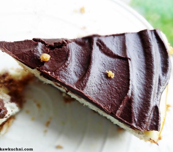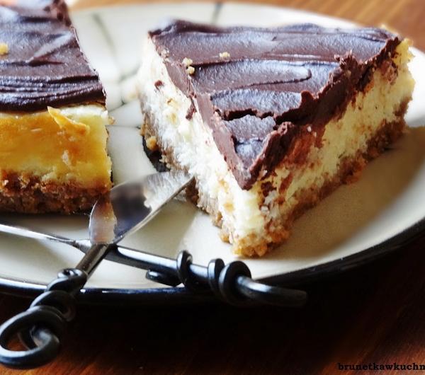 Sernik był w zasadzie wypadkową tego, co znalazłam w szafkach. Nie mogłam się zdecydować, na jaki mam największą ochotę, więc zadecydował przypadek. I tak do sernika trafiły wiórki kokosowe zakupione „na wszelki wypadek”, kokosowy likier pozostały po innym wypieku oraz ganache, który miał zdobić ciasto czekoladowe w środę, ale nic z niego nie wyszło. Za to sernik wyszedł i to bardzo smaczny :)