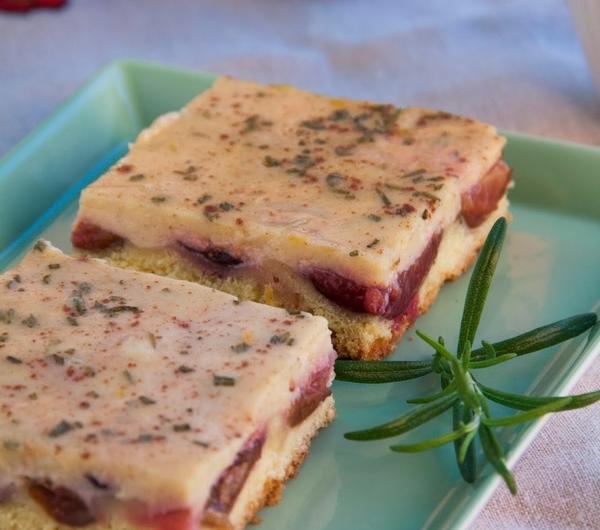 Ostatnio na blogach zrobiła się moda na dodawanie rozmarynu do słodkich wypieków. Bardzo zaciekawił mnie ten pomysł i postanowiłam ulec tej modzie i muszę przyznać, że jestem bardzo pozytywnie zaskoczona. Postanowiłam trochę pokombinować i stworzyć coś swojego. A więc mamy tu kruche ciasto z dodatkiem mąki kukurydzianej dzięki czemu ciasto jest jest bardziej kruche i ma fajny żółty kolor. Do tego są śliwki i pycha polewa w skład, której wchodzi wcześniej wspomniany rozmaryn, miód, cynamon, skórka cytryny. Ciasto w smaku okazało się rewelacyjne a składniki genialnie do siebie pasują. Zdecydowanie polecam!Składniki:1,5 szklanki mąki pszennej1 szklanka mąki kukurydzianej150 g masła3/4 szklanki cukru pudru1 łyżeczka proszku do pieczenia2 jajka1 żółtkoszczypta soliew. 1 łyżka zimnej wodyokoło 500 g śliwek węgierekPolewa:2 jajka2 czubate łyżki kwaśnej śmietany 18%2 czubate łyżki miodu1/2 łyżeczki cynamonuskórka z jednej cytryny1 płaska łyżeczka drobno pokrojonego rozmarynuForemka 33x23cmZ podanych składników zagniatamy ciasto, zawijamy w folie i wkładamy do lodówki na 30 minut. Po upływie tego czasu wykładamy ciasto do wyłożonej pergaminem i natłuszczonej formy. Spód i boki! Boki ciasta podczas pieczenia spłyną na dół i powstanie coś w stylu korytka dzięki temu polewa nie spłynie pod spód ciasta! Ciasto można wyłożyć dłońmi albo rozwałkować i przenieść na blaszkę. Na spodzie układamy połówki śliwek ( miąższem do góry). Wkładamy do piekarnika na 25 minut, pieczemy w temp. 180*C. Wszystkie składniki polewy dokładnie mieszamy i wylewamy na podpieczony spód. Wkładamy do piekarnika na 25-30 minut.