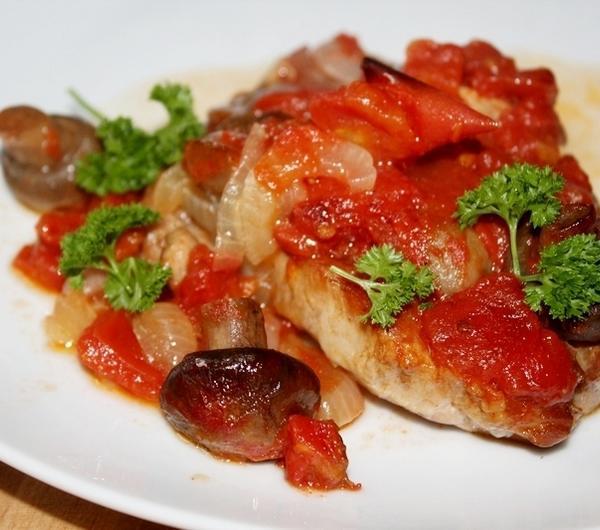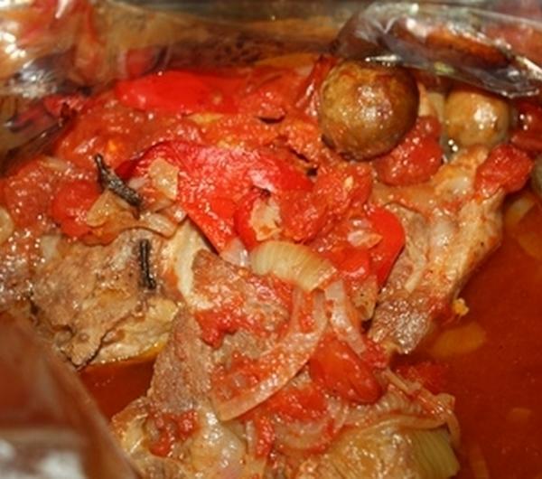 Składniki :1 kg karkówki bez kości1 duża papryka słodka , opcjonalnie czerwonatrochę pieczarek – około 10-15 szt2 małe cebulki lub jedna średnia1 puszka pomidorów krojonych1/2 łyżeczki ostrej , mielonej papryki2 ząbki czosnku1 łyżeczka słodkiej mielonej papryki3-4 goździki -dają fajny aromat1 łyżeczka cukru – czubatasól do smakuworeczek do pieczenia