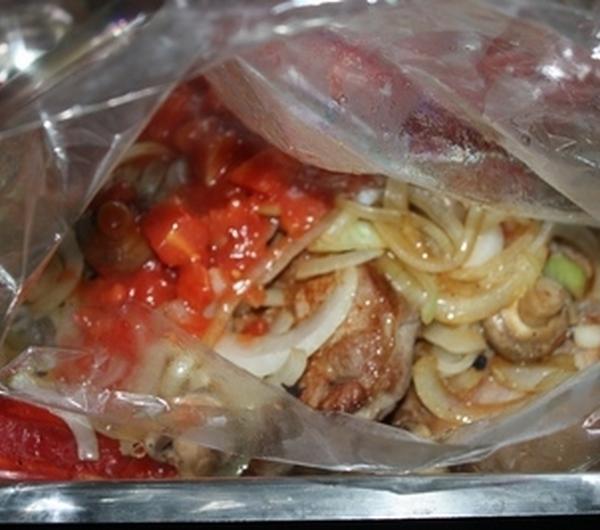 Karczek , kroimy w równej grubości plastry , mniej więcej 1,5 cm . Takie żeby było czuć mięso , przy gryzieniu 😉 Mięso lekko solimy , posypujemy papryką słodką i ostrą , odstawiamy na godzinkę ,żeby się przegryzła . Po tym czasie , obsmażamy z obu stron , tak ,żeby wierzch zrobił się złoty i przypieczony . Przekładamy do woreczka do pieczenia . Cebulę , paprykę , kroimy , pieczarki wrzucamy w całości ( duże można pokroić ) i podsmażany na odrobinie oleju , po 2 minutach podsmażania dodajemy wyciśnięte ząbki czosnku , smażymy jeszcze minutkę . Przekładamy warzywa do woreczka z karkówką , układając je na wierzchu . Pomidory z puszki ,mieszamy z cukrem , odrobiną soli, dodajemy goździki i wylewamy na pozostałe składniki , woreczek zawiązujemy i wkładamy na blaszce do pieczenia do piekarnika nagrzanego do 150 C , na 1,5 godziny . Po tym czasie możemy wyciągnąć i podać naszą pyszną , kruchą i aromatyczną karkówkę . Smacznego 😉