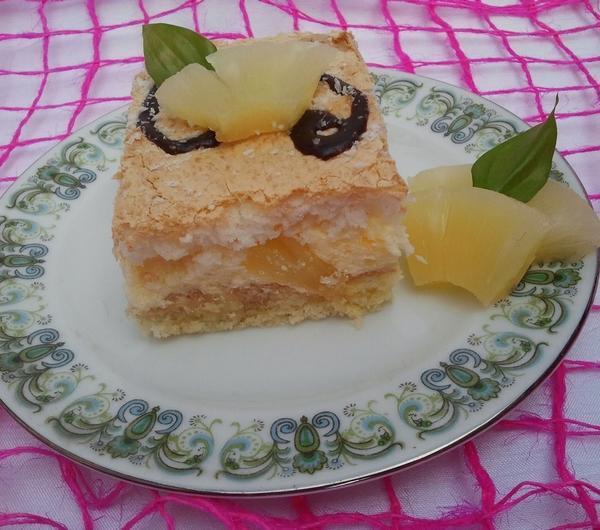 Pina coalda, jak nietrudno się domyślić, to ciasto w egzotycznym klimacie. Krem budyniowy z ananasem i kokosowa beza, to bardzo smaczne połączenie. Robiłam je już kilka razy, bo przepis jest niezawodny. Tym razem upiekłam je na imprezę urodzinową męża, ale wcześniej wystapiło również w formie tortu na chrzciny mojej kuzynki Marysi.Przy okazji chciałabym podziękować Myszce za nominację do Liebster Blog, ale z reguły nie biorę udziału w tego typu przedsięwzięciach, dlatego tu mój udział się kończy. Jednocześnie jest mi bardzo miło, że zostałam wyróżniona.A teraz czas na ciasto.Składniki: na biszkopt: (blaszka 24*35 cm)4 jajka3/4 szklanki mąki3/4 szklanki cukru1 płaska łyżeczka proszku do pieczeniaZ podanych składników upiec biszkopt, wystudzić i nasączyć herbatą. na krem:puszka ananasa w syropie (owoc i sok)1 opakowanie budyniu waniliowego2 łyżki cukru125 g masłaAnanasa odsączyć. Sok uzupełnić zimną wodą tak, aby w sumie było 500 ml. Część odlać, rozmieszać budyń i cukier, resztę zagotować. Ugotować budyń, przykryć garnek pokrywką i odstawić do ostygnięcia, mieszając co chwilę. Masło utrzeć do miękkości, następnie ucierając dodawać zimny budyń. Ananasa drobno pokroić, wmieszać do kremu. `Krem rozsmarować na biszkopcie. na płytę kokosową:4 białkaszczypta soli1 szklanka cukru pudru150 g kokosuBiałka ubić z solą i pudrem na sztywno. Dodać kokos, wymieszać. Przelać do formy wyłożonej papierem. Piec około 20 minut w 150*C, a później przez około 10 minut w 170*C. Wystudzić, delikatnie zdjąć papier, przełożyć na krem, docisnąć.A tak wyglądał tort:
