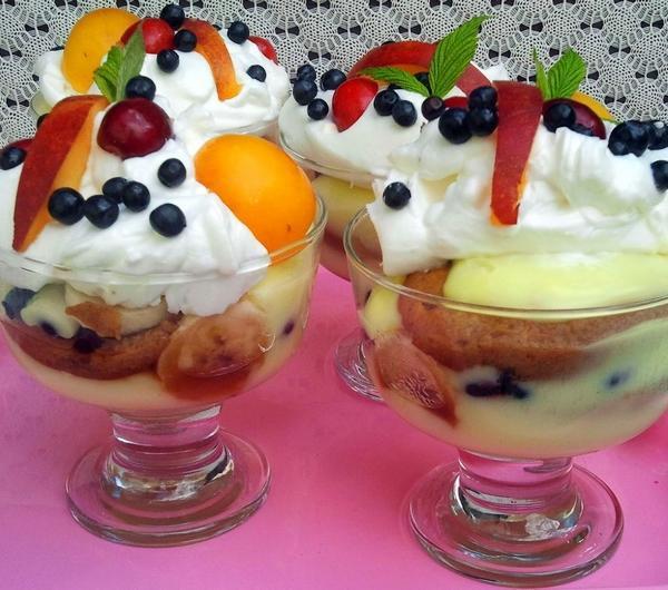 To mój ulubiony deser. Wyjście awaryjne na wypadek niespodziewanych gości. Można go podać na zimno z bitą śmietaną lub na ciepło tylko z owocami. W obu wersjach jest pyszny. A do tego łatwy do zrobienia i tani.Składniki: na 6 pucharków:1 litr mleka2 opakowania budyniu waniliowego (na 1/2 l mleka)3 łyżki cukru1 paczka biszkoptów1 szklanka wystudzonej posłodzonej kawy250 ml śmietanki kremówki1 łyżka cukru pudruowoce (jagody, banany, żółte śliwki, czereśnie, nektarynki)ewentualnie odrobina alkoholuTrzy szklanki mleka zagotować. W pozostałym mleku rozpuścić budynie i cukier. Wlać na gotujące się mleko i zagotować aż zgęstnieje. Do pucharków nałożyć po łyżce budyniu. Biszkopty moczyć w kawie (można dodać alkoholu) i układać na budyniu. Owoce pokroić i dodać do deseru. Przykryć kolejną warstwą budyniu, biszkoptów aż do wyczerpania składników. Śmietankę ubić z cukrem pudrem i udekorować nią wystudzony deser. Przed podaniem dodać owoce.