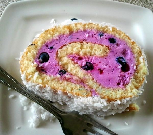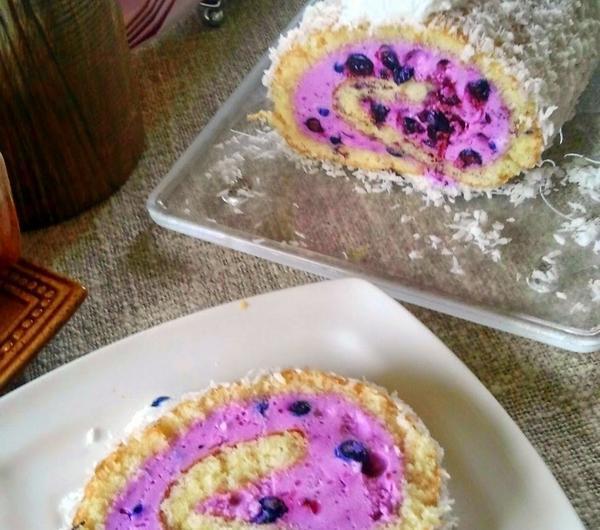 5 jajek1 szklanka cukru1 i 1/2 szklanki mąki1 łyżeczka proszku do pieczenia na nadzienie:300 g serka Wieluń Mój Ulubiony1 szklanka borówek leśnych1 galaretka jagodowa2 łyżki cukru pudrudo obtoczenia:4-5 łyżek bitej śmietany1/2 szklanki kokosuBiałka ubić z cukrem na sztywno. Ubijając dodawać po żółtku. Mąkę wymieszać z proszkiem do pieczenia i delikatnie wmieszać do masy jajecznej. Blaszkę z wyposażenia piekarnika wyłożyć papierem i rozsmarować ciasto. Piec około 25-30 minut w 175*C. Zaraz po wyjęciu z piekarnika ciasto przełożyć na wilgotną ściereczkę papierem do góry. Zdjąć papier i zwinąć ciasto razem ze ściereczką.Galaretkę rozpuścić w 1/2 szklanki wody i wystudzić. Serek zmiksować z połową jagód i cukrem pudrem, następnie wlać galaretkę. Do masy dodać resztę jagód i delikatnie wymieszać. Roladę rozwinąć, ściereczkę usunąć. Na biszkopcie rozsmarować nadzienie, przy jednym z boków zostawić margines. Zwinąć w roladę w stronę wolnego boku. Owinąć ściereczką i schłodzić w lodówce. Przed podaniem roladę obtoczyć w bitej śmietanie i kokosie.