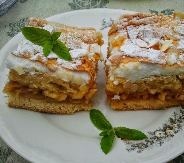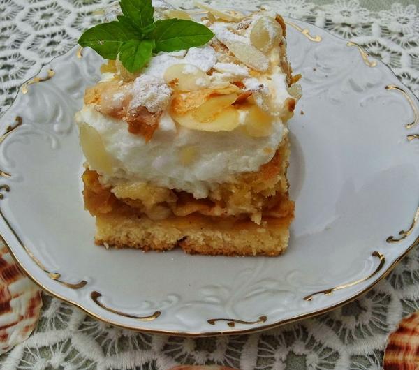 To ciasto rozpływa się w ustach. Mękkie ciasto, wilgotne jabłka i lekka pianka pod posypką z chrupiącyh migdałów to przepyszne połączenie. Nie sposób poprzestać na jednym kawałku.*foremka 25*34 cmSkładniki: na ciasto:500 g mąki6 żółtek250 g cukru pudru250 g masła2 łyżeczki proszku do pieczenia na masę jabłkową:1,5 kg jabłek1 opakowanie galaretki cytrynowej1 łyżka cukru2 łyżeczki cynamonu na piankę:6 białek pozostałych z ciasta3/4 szklanki cukru3 łyżki płatków migdałowychcukier puder do posypaniaSkładniki ciasta zagnieść. Jeśli ciasto będzie zbyt suche i nie bedzie chciało się kleić to należy dodać kilka łyżek kwaśnej śmietany. Podzielić ciasto na dwie części i schować do lodówki. Jabłka zetrzeć na tarce o grubych oczkach. Zasypać cukrem i cynamonem i dusić kilka minut. Zdjąć z ognia i wsypać galaretkę. Wymieszać. Przestudzić.Jedną częścią ciasta wyłożyć dno blaszki wyścielonej papierem. Rozsmarować masę jabłkową i przykryć drugą połową ciasta. Piec 30 minut w 180*C. Z białek i cukru ubić pianę i rozłożyć na cieście, posypać migdałami. Piec 30 minut w 170*C. Po wystudzeniu posypać cukrem pudrem.