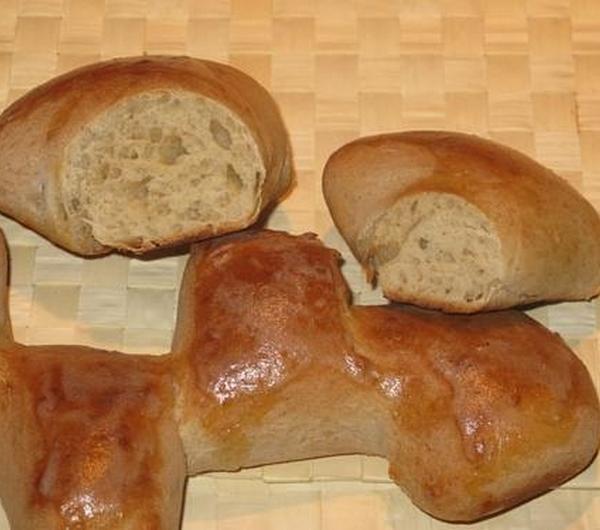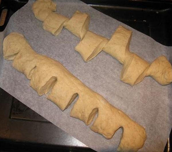 Przepis na 3 bochenki1 paczka suszonych drożdży0,25 szklanki ciepłej wody1 łyżka cukru (pominęłam ze względu na dużą zawartość miodu)2 szklanki maślanki przegotowanej i ostudzonej maślanki (40-45 st)2 łyżki miękkiego masła0,25 szklanki miękkiego miodu2 łyżeczki soli2 jajka0,5 szklanki mąki sojowej (zastąpiłam pszenną)2 szklanki mąki pszennej pełnoziarnistej5-5,5 szklanki mąki pszennej chlebowej lub zwykłejWszystkie składniki wrzuciłam do automatu do chleba i uruchomiłam program ciasto rosnące (ok. 1 h 25 min). Po pierwszym i drugim zagniataniu kontrolowałam ilość mąki i płynów. Ciasto musi być elastyczne ale dość zwarte. Po tym czasie wyjęłam wyrośnięte ciasto i podzieliłam na 3 części. Z każdej części uformowałam bagietkę (ok 40 cm). Ułożyłam na wyłożonej pergaminem blaszce, a następnie ponacinałam ją ostrym nożem ( w oryginale każdą bułę na 6 kawałków) i powywijałam jak zawiasy (w przeciwne strony):