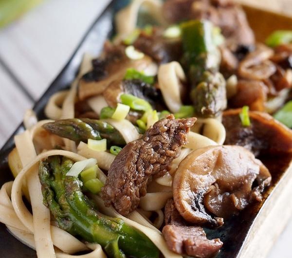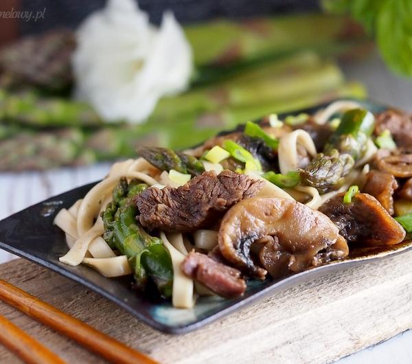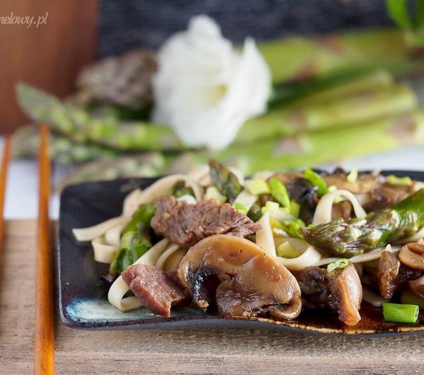 (3-4 porcje)Składniki:650 g ulubionej części wołowiny, ja najczęściej używam sezonowanego rostbefu, pokrojonego w cienkie plasterki, koniecznie w poprzek włókien3 łyżki mirinu3 łyżki sosu sojowego2 łyżki sake2 łyżki brązowego cukru1/4 łyżeczki płatków chili2 ząbki czosnku, posiekane200 g szparagów, przyciętych i pokrojonych na kawałki (można zamienić na fasolkę szparagową)150 g pieczarek, pokrojonych w plasterki2 łyżki oliwy z oliwekposiekana dymka do podaniaPrzygotowanie:W małej miseczce wymieszaj mirin, sos sojowy, sake, brązowy cukier, chili i czosnek. Zalej marynatą mięso i włóż do lodówki na kilka godzin, a najlepiej na noc.W woku lub głębokiej rozgrzej na dużym ogniu oliwę i dodaj mięso wraz z marynatą.Dodaj szparagi (lub fasolkę) i pieczarki i smaż aż mięso się zarumieni a sos zgęstnieje, przez około 10 minut.Podawaj danie z ugotowanym makaronem lub ryżem, posypane posiekaną dymką.Smacznego!