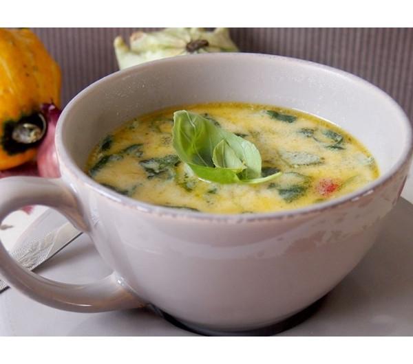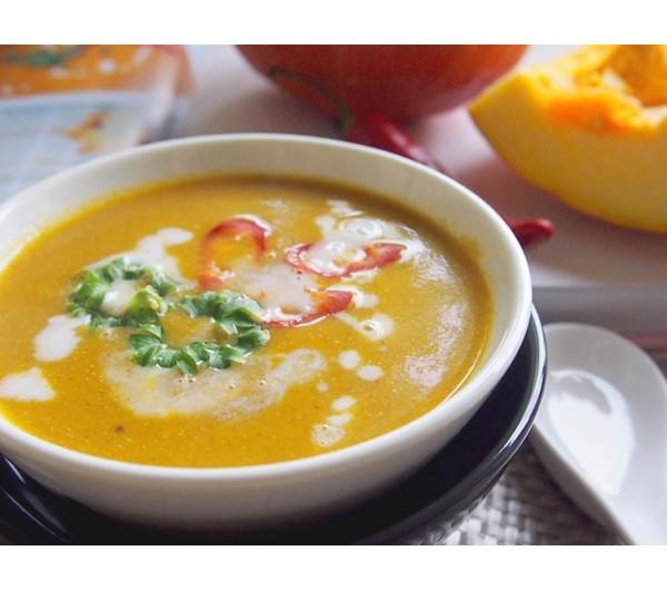 bulion, doprowadź całość do wrzenia na dużym ogniu. Zmniejsz ogień do małego i gotuj na przez kolejne 25 minut.Gdy zupa lekko ostygnie, przełóż ją do blendera i zmiksuj na gładką masę. Przełóż ponownie do rondla i dobrze wymieszaj.Dopraw do smaku jeżeli będzie to konieczne.Nałóż zupę do miseczek i podawaj ze