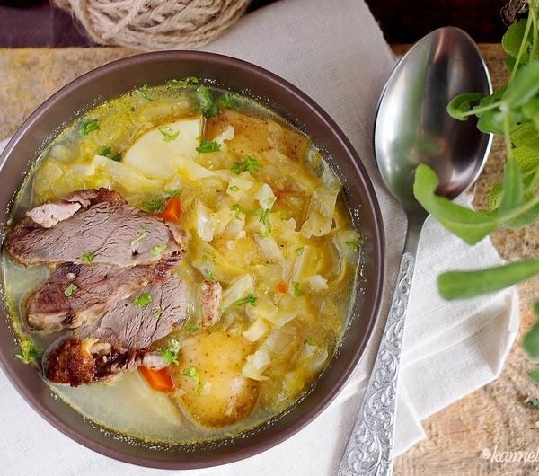 Zupa warzywna z młodą kapustą(8 porcji)Składniki:3 łyżki masła3 młode pory, pokrojone w cienkie plasterki (można zamienić na 1 średnią cebulę)1 duża marchewka, obrana i pokrojona w kostkę1 średni seler, obrany i pokrojony w kostkę2 korzenie pasternaku, obrane i pokrojone w kostkę1/2 główki młodej kapusty, posiekanej3 łodygi selera naciowego, pokrojone w drobną kostkę6 ząbków czosnku, pokrojonych w cienkie plasterki6 młodych ziemniaków, wyszczotkowanych i pokrojonych w kostkę2 liście laurowesól i pieprz8 szklanek bulionu warzywnego i drobiowego1/2 szklanki śmietanki 30%3 łyżki posiekanej natki pietruszki do podaniaPrzygotowanie:W większym rondlu na średnim ogniu rozpuść masło, po czym włóż pora, marchewkę, selera, pasternak, kapustę, selera naciowego, czosnek, ziemniaki, liście laurowe i dopraw solą i pieprzem.Przykryj garnek i smaż warzywa, mieszając od czasu do czasu, przez 10-15 minut do lekkiego zarumienienia.Następnie wlej bulion, wymieszaj i doprowadź zupę pod przykryciem do wrzenia. Gotuj na średnim ogniu przez 20-30 minut, lub do miękkości warzyw. 10 minut przed końcem gotowania dodaj śmietankę.Zdejmij garnek z ognia, wyjmij i wyrzuć liście laurowe i dopraw zupę solą i pieprzem jeżeli to konieczne.Podawaj zupę posypaną natką pietruszki, najlepiej ze świeżym pieczywem.Smacznego!