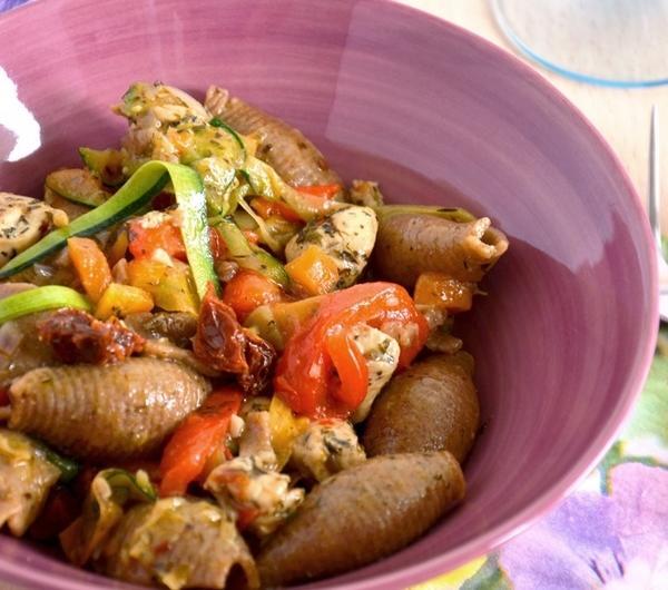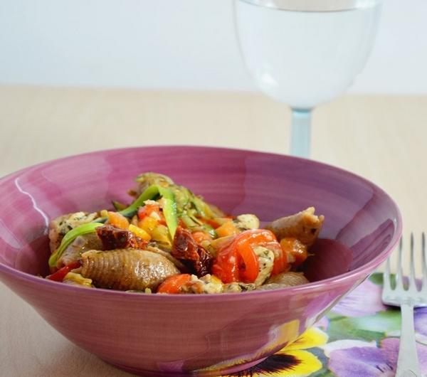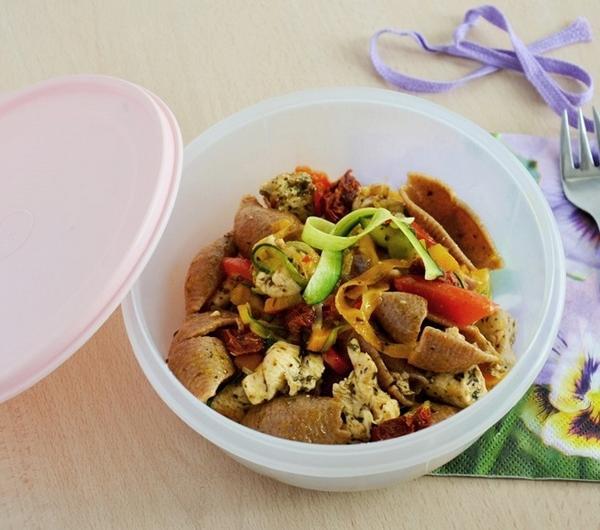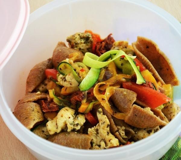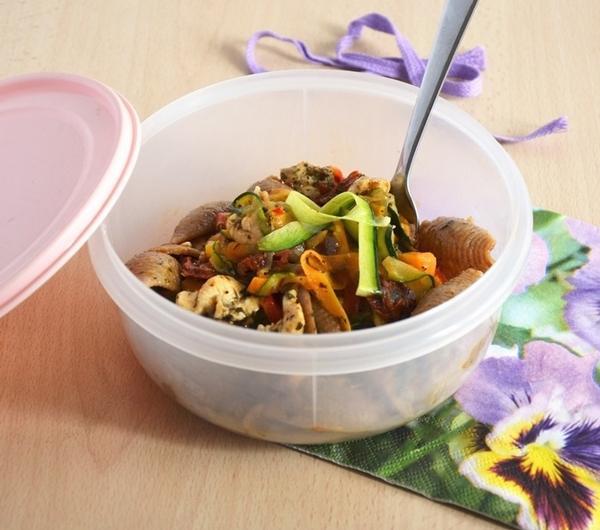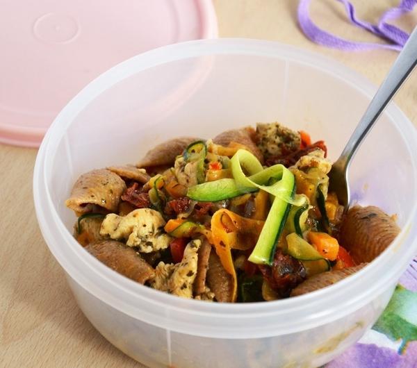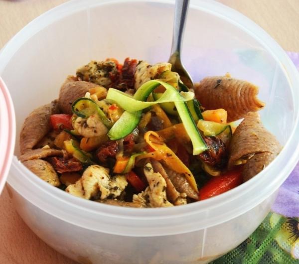 Składniki (na ok 3 porcje):200 g pełnoziarnistego makaronu1 spora pojedyncza pierś z kurczaka1 papryka1/2 cukinii1 marchewka1/2 czerwonej cebuli1 ząbek czosnku (można pominąć, ale ja uważam, że nadaje on aromat, a później wcale nie pachniemy czosnkiem)2-3 łyżki oliwy z oliwekok 5 suszonych pomidorówprzyprawy: suszone oregano, bazylia, tymianek, sól, pieprzPrzygotowanie:Kurczaka oczyszczamy z błonek, kroimy w kostkę. Oprószamy solą, pieprzem oraz przyprawami (mniej więcej po pół łyżeczki) i odstawiamy na ok 30 minut. Paprykę opalamy nad palnikiem, aż skórka zrobi się czarna, zawijamy szczelnie w folię spożywczą i odstawiamy na ok 15 minut. Po tym czasie paprykę obieramy ze skórki i kroimy w drobną kosteczkę. Paprykę można też upiec w piekarniku (180 stopni, ok 20 minut), i później również od razu zawinąć w folię i następnie zdjąć skórkę. Makaron gotujemy al dente wg przepisu na opakowaniu. W między czasie czosnek i cebulę kroimy w drobną kostkę. Z cukinii i marchewki robimy cieniutkie paseczki przy pomocy obieraczki, a pozostałe części siekamy w kosteczkę. Na patelni rozgrzewamy oliwę z oliwek dodajemy cebulę i paprykę (jeśli jej nie piekliśmy), smażymy chwilkę, dodajemy czosnek i kurczaka. Wszystko smażymy aż kurczak nie będzie surowy. Po tym czasie dodajemy dodajemy pokrojone w paseczki suszone pomidory, paprykę (jeśli jest upieczona) oraz cukinię i marchewkę. Wszystko dokładnie mieszamy, doprawiamy do smaku ziołami, solą oraz pieprzem i smażymy jeszcze chwilę, aż warzywa lekko zwiędną i puszczą wodę (oczywiście mogą pozostać lekko chrupiące). Do gotowych warzyw z kurczakiem dodajemy ugotowany makaron i wszystko mieszamy, aby makaron oblepił się warzywami i oliwą. Możemy jeść od razu, albo wrzucić do pojemnika i zabrać ze sobą. Jest równie dobre na zimno jak i na ciepło.